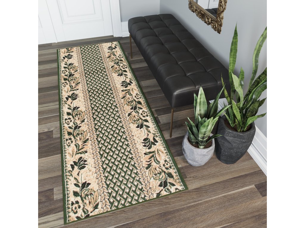 Běhoun ATLAS 7192C zelený béžový s klasickým květinovým vzorem.Atlas koberce a běhouny je kolekce vyrobená z polypropylenových vláken o výšce vlasu 8 milimetrů a hmotnosti 1350 g / m2. Koberce PP BCF se vyznačují především velmi vysokou odolností proti oděru, jejich vlákna jsou elastická a odolná proti deformaci. Snadno se čistí, včetně vysávání a mokrého mytí šampony. Mají také vysoký koeficient tepelné vodivosti, takže je lze použít v místnostech s podlahovým vytápěním. Kolekce koberců Atlas zahrnuje širokou škálu klasických i moderních vzorů, včetně geometrických, květinových, perských a různých velikostí.
