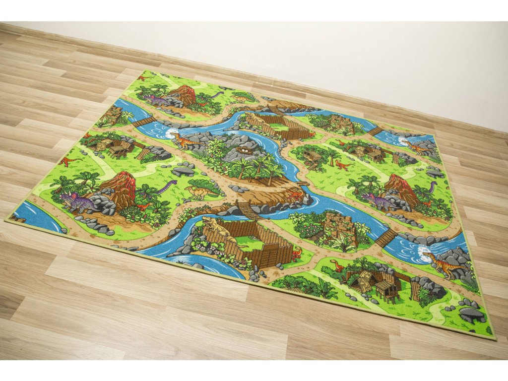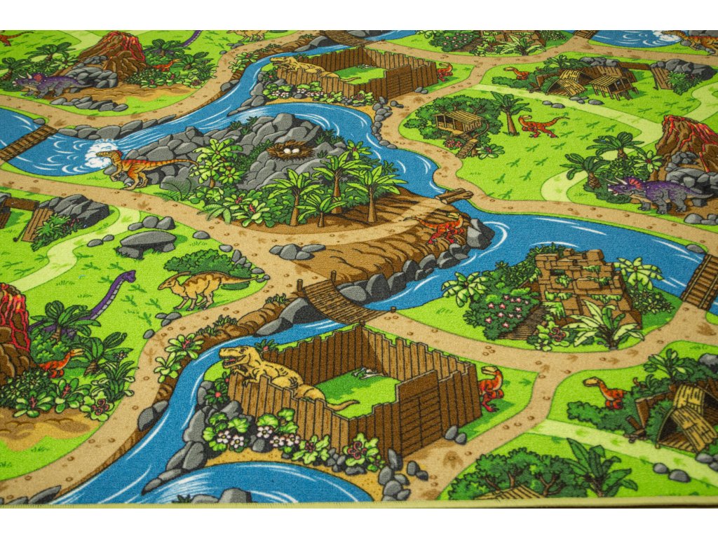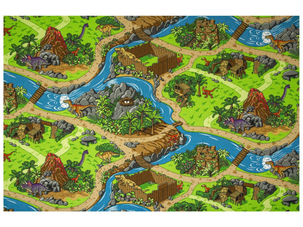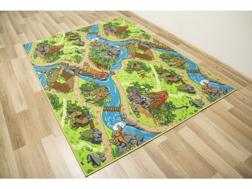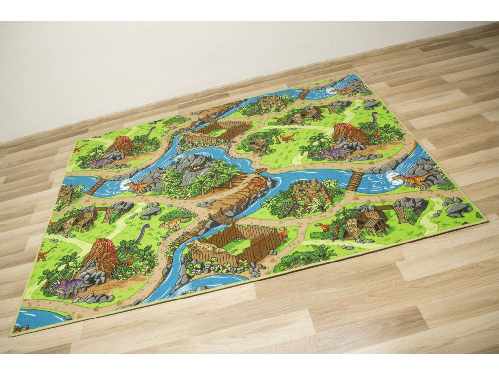 Dětský kusový koberec Dino Vesnička Dinosaurů zelený modrý je plný dinosaurůDětský koberec je vyrobený z kvalitní polyamidové příze s celkovou výškou 6,5 mm. Tento koberec je určen pro všechny děti které mají rádi zvířátka a zvláště dinosaury.