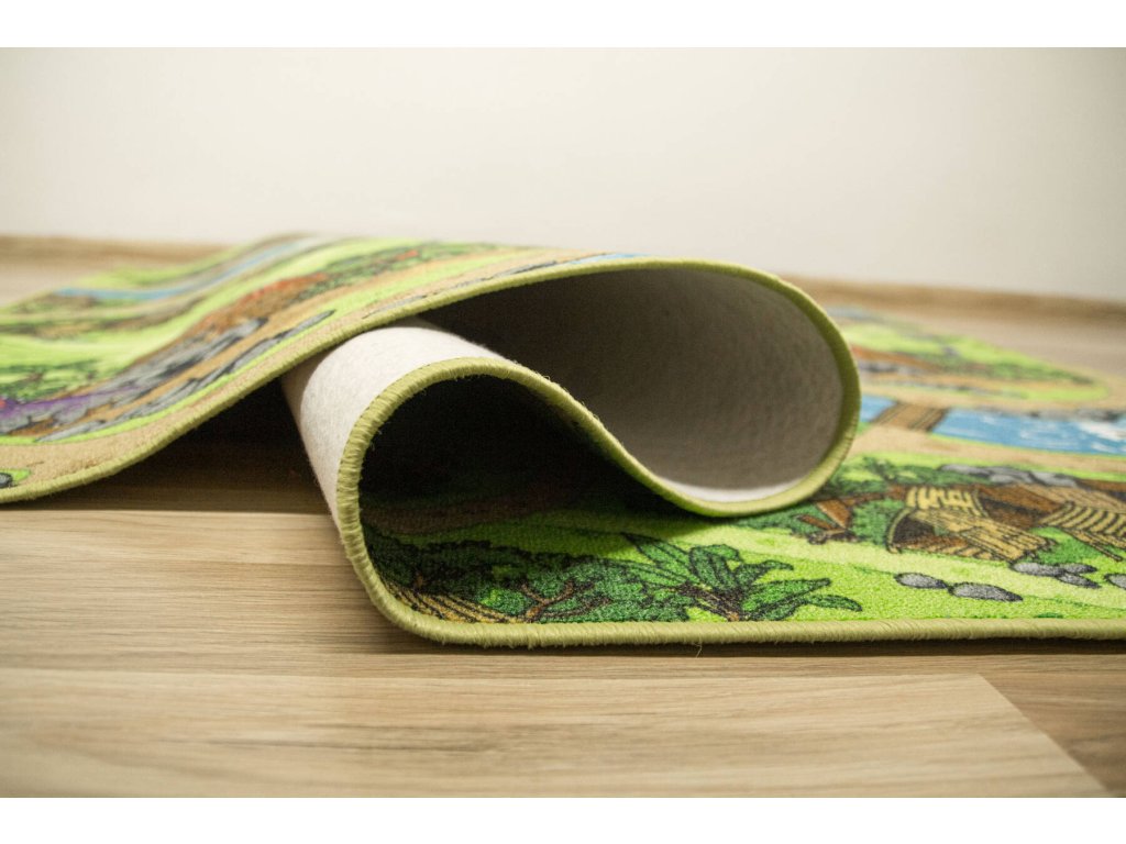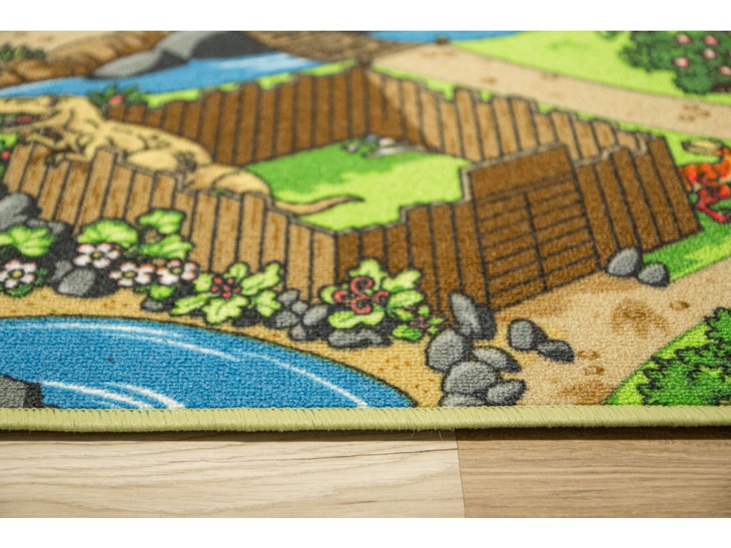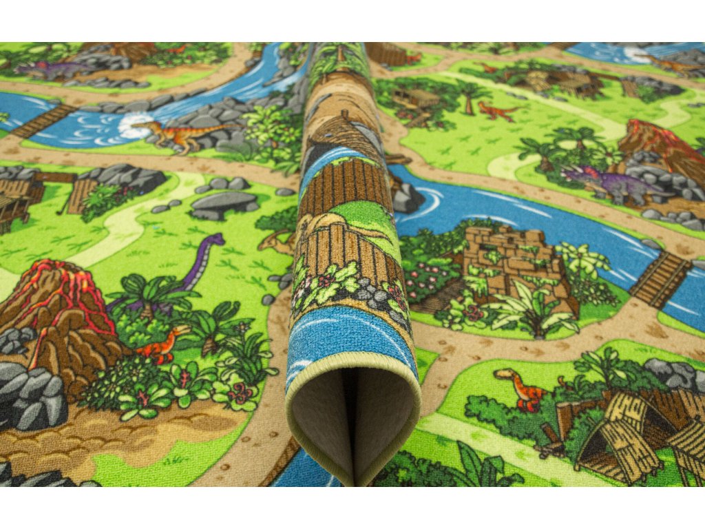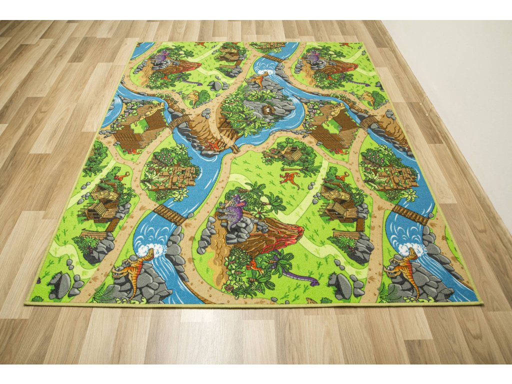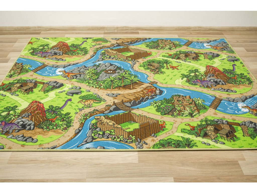 Dětský kusový koberec Dino Vesnička Dinosaurů zelený modrý je plný dinosaurůDětský koberec je vyrobený z kvalitní polyamidové příze s celkovou výškou 6,5 mm. Tento koberec je určen pro všechny děti které mají rádi zvířátka a zvláště dinosaury.