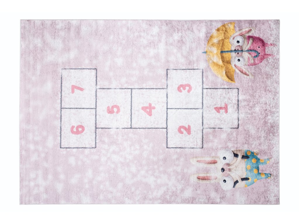 Dětský kusový koberec vhodný k praní BAMBINO 2227 Zajíček Prasátko Skákací panák protiskluzový krémový růžový