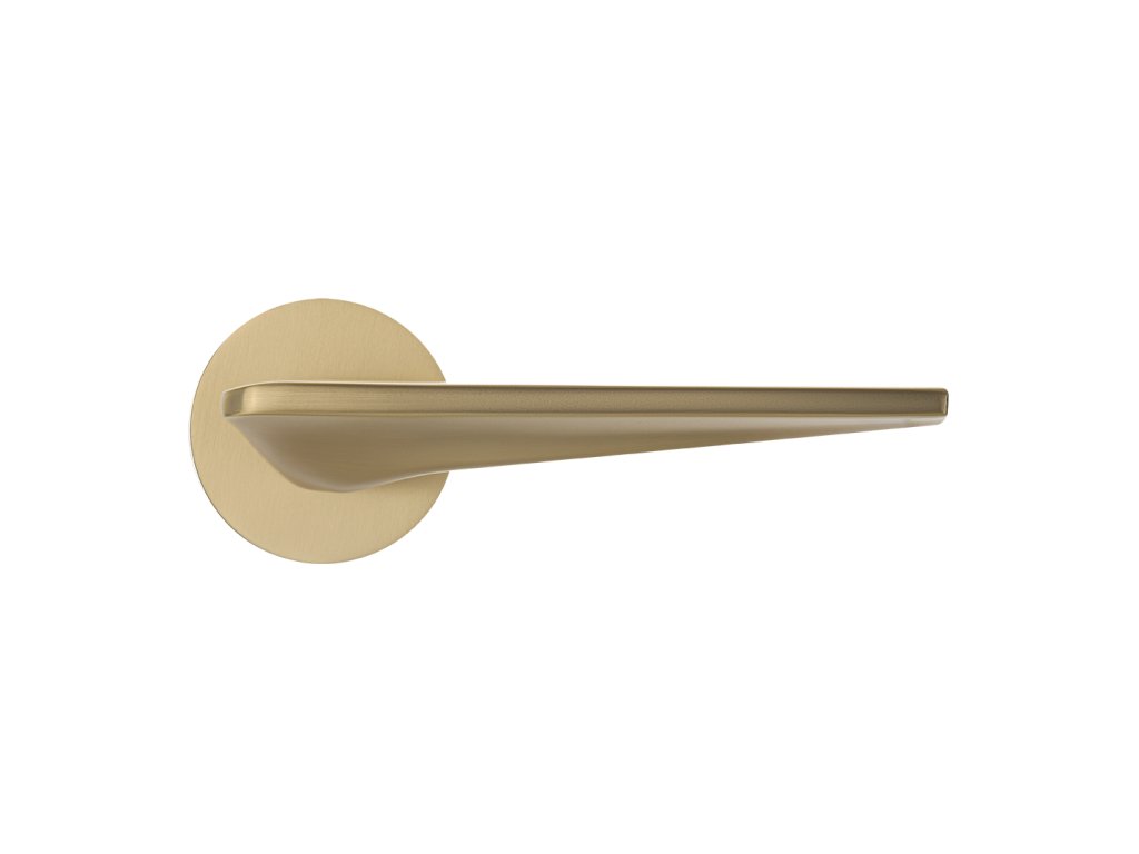 Klika Celestria v kartáčovaném zlatém provedení je dokonalým příkladem harmonie mezi moderním designem a elegancí. Kulatá, štíhlá rozeta a ergonomická rukojeť vytvářejí decentní tvar, který přitahuje pozornost, a její jemná textura v kartáčovaném zlatě vnáší do každého interiéru teplý a luxusní akcent.