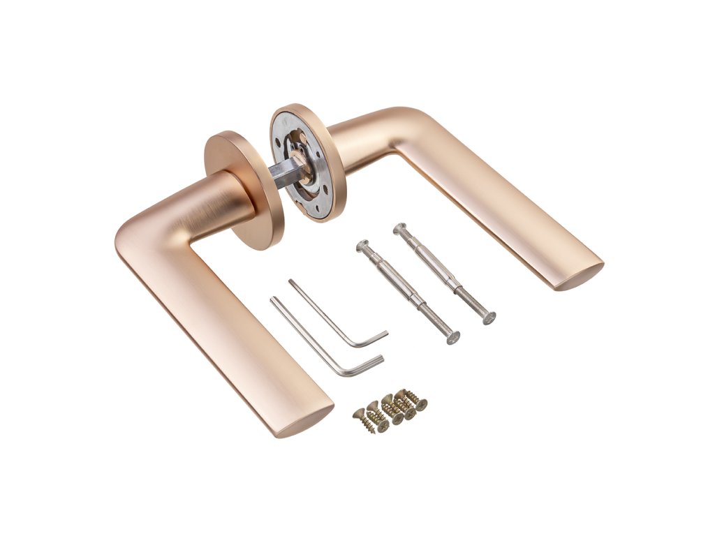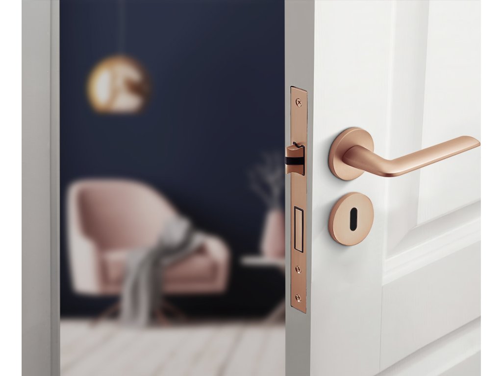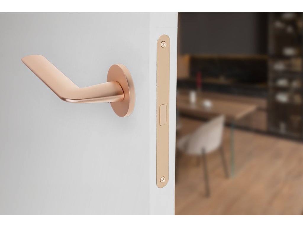Klika MAROKO kulatá rozeta - růžové zlato - (komplet 2 ks)Klika Maroko s děleným štítkem v růžovém zlatě je elegantní a funkční produkt, který přináší mnoho výhod do každého interiéru. Zaoblený tvar rukojeti umožňuje pohodlné používání a absence hranatých hran zajišťuje bezpečnost a pohodlí při otevírání a zavírání dveří. Jedním z charakteristických rysů této kliky je její moderní vzhled, který je zajištěn použitím štíhlé rozety o tloušťce 6 mm.