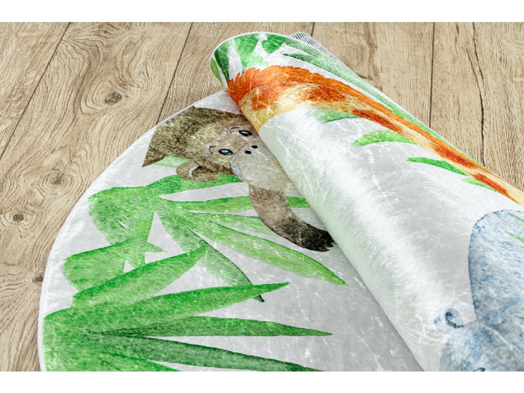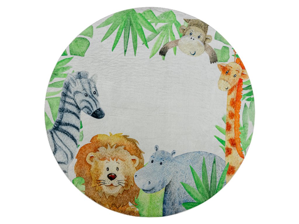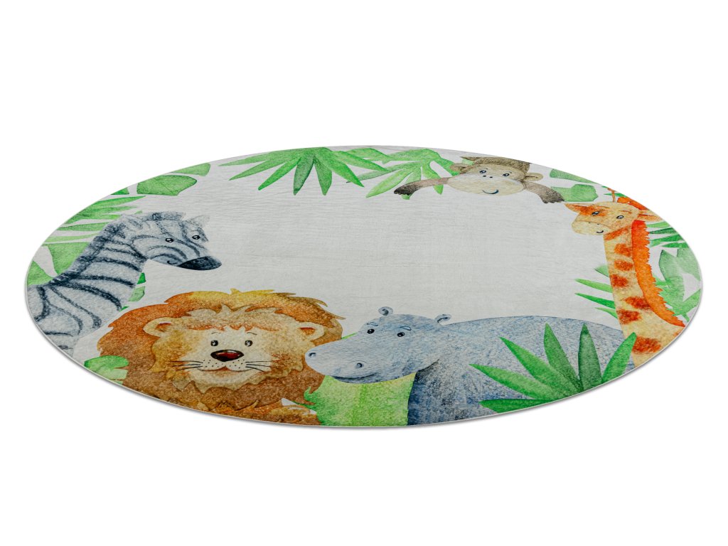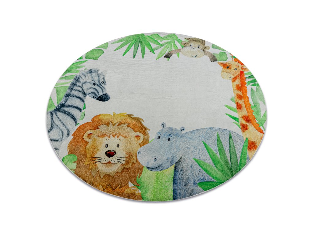 Kulatý dětský koberec vhodný k praní BAMBINO 54090 Hroch Lev Žirafa Opička bílý zelený