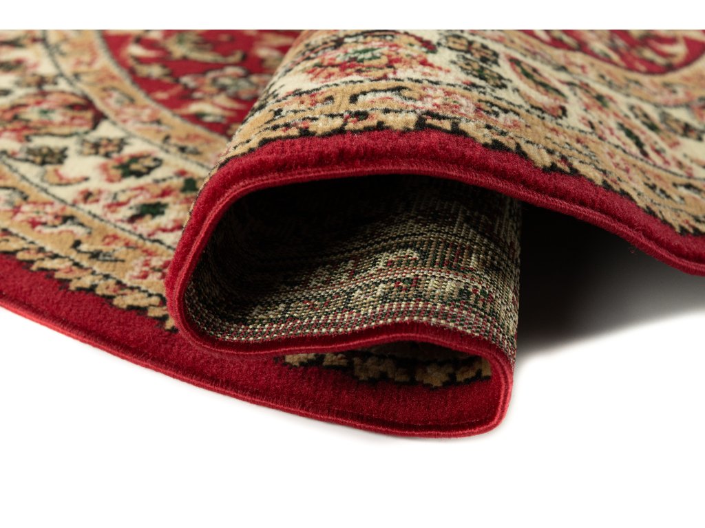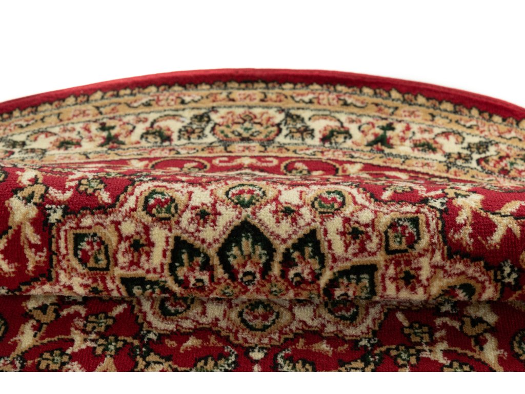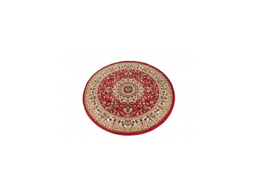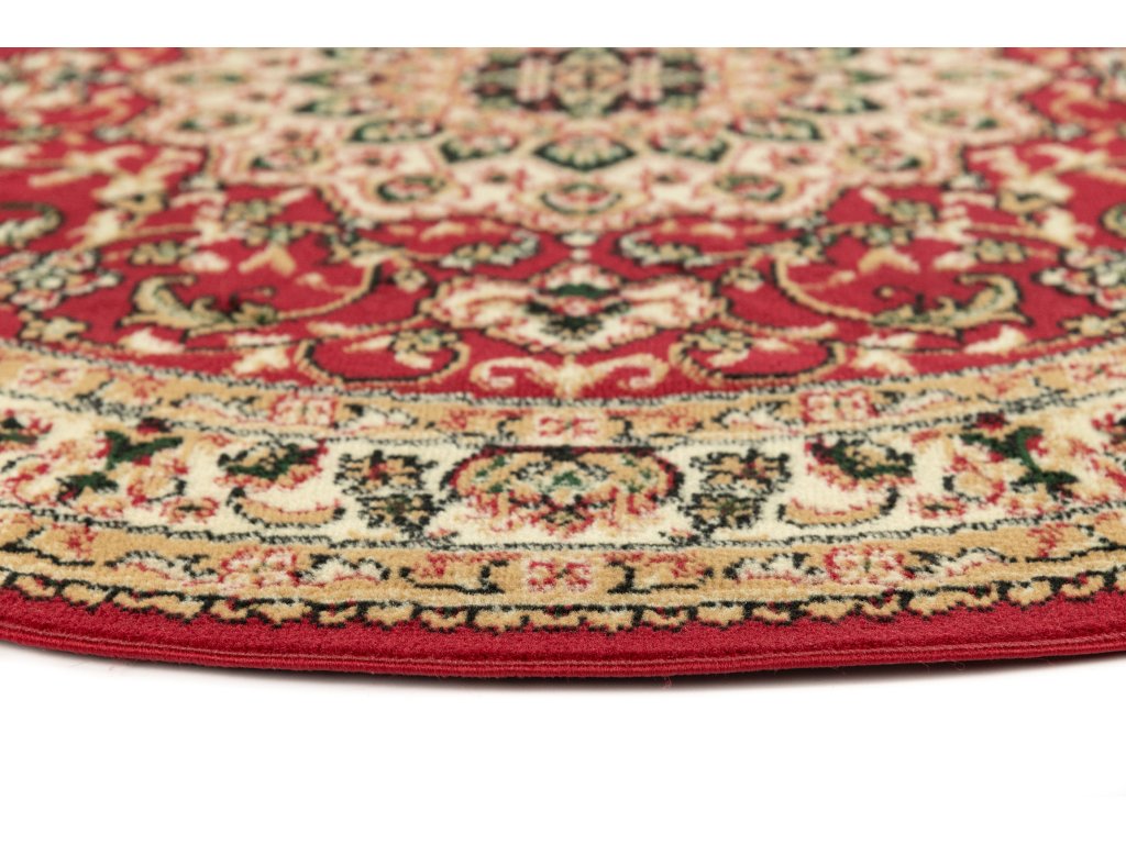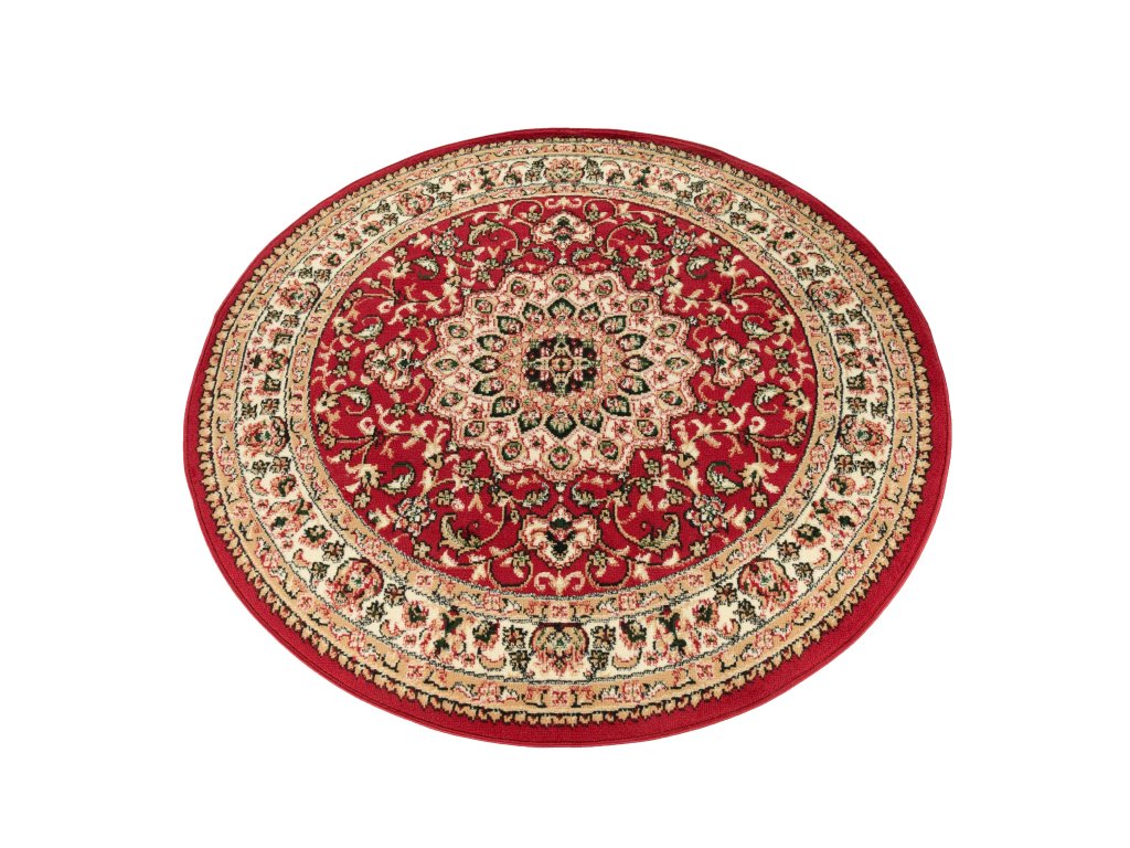 Kulatý koberec ATLAS F740A červený s klasickým vzoremAtlas koberce je kolekce koberců vyrobených z polypropylenových vláken o výšce vlasu 8 milimetrů a hmotnosti 1350 g / m2. Koberce PP BCF se vyznačují především velmi vysokou odolností proti oděru, jejich vlákna jsou elastická a odolná proti deformaci. Snadno se čistí, včetně vysávání a mokrého mytí šampony.