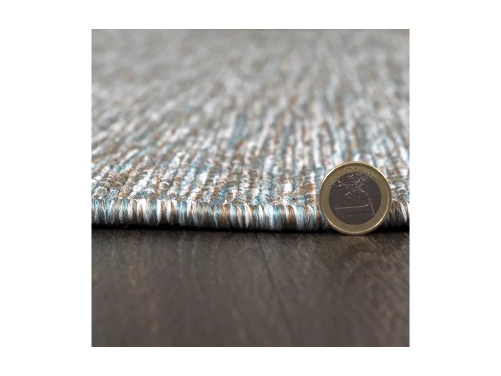 Tento hnědý modrý sisalový koberec je perfektním doplňkem na terasu, balkon nebo verandu a je vhodný i pro domácí použití. Vyroben z odolných materiálů, tkaný naplocho, je odolný vůči povětrnostním vlivům a snadno se čistí.