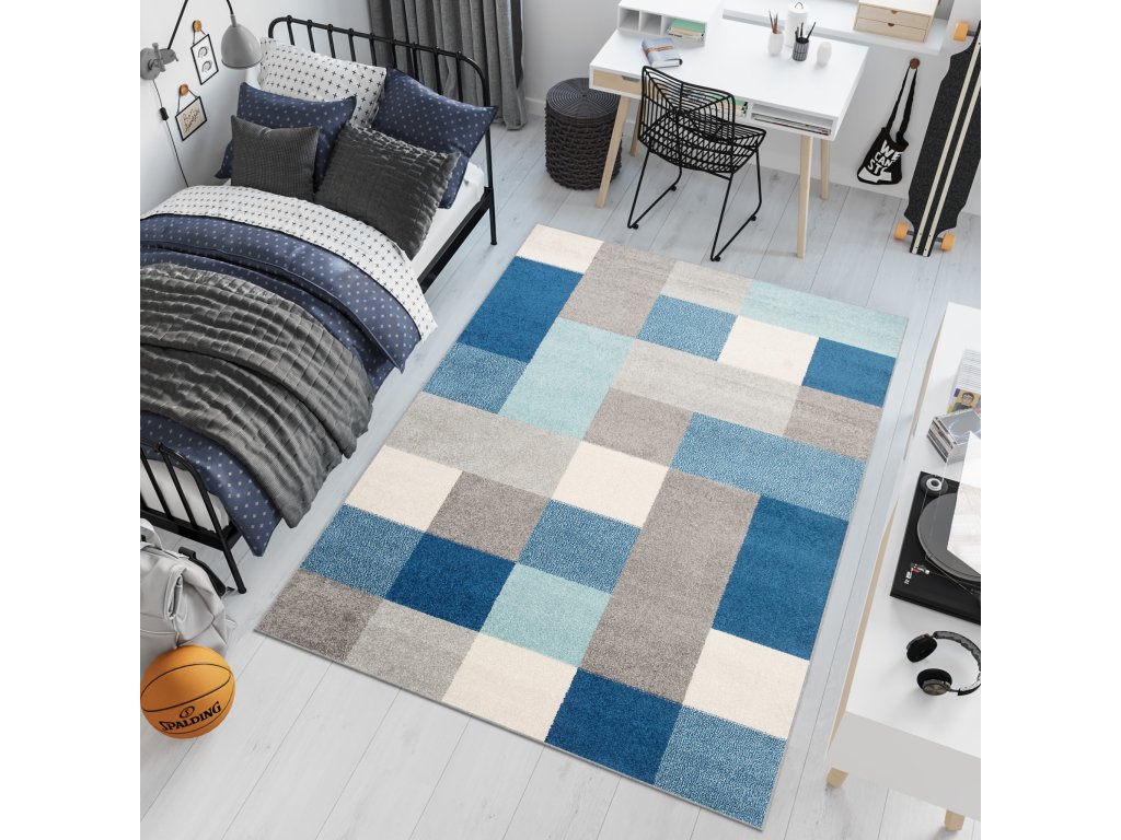 Kusový koberec LAZUR C574B šedý modrý s moderním kostkovaným geometrickým vzorem.Koberce Lazur velmi měkké a milé v doteku, díky speciální polypropylénové přízi Calping Frise. Vlákna tvoří hustý hrubý vlas s výškou 9 mm a váhou koberce 1,40 kg/m2. Technologie Calping frise přiblížila tyto koberce co do kvality vlasu ke kobercům vlněným, s tím, že si uchovaly všechny výhody koberců syntetických. Koberce se dobře udržují a stačí je vysát, nebo na větší nečistoty navlhčený hadřík. Koberce lazur to je pestrá směs vzorů a barev.
