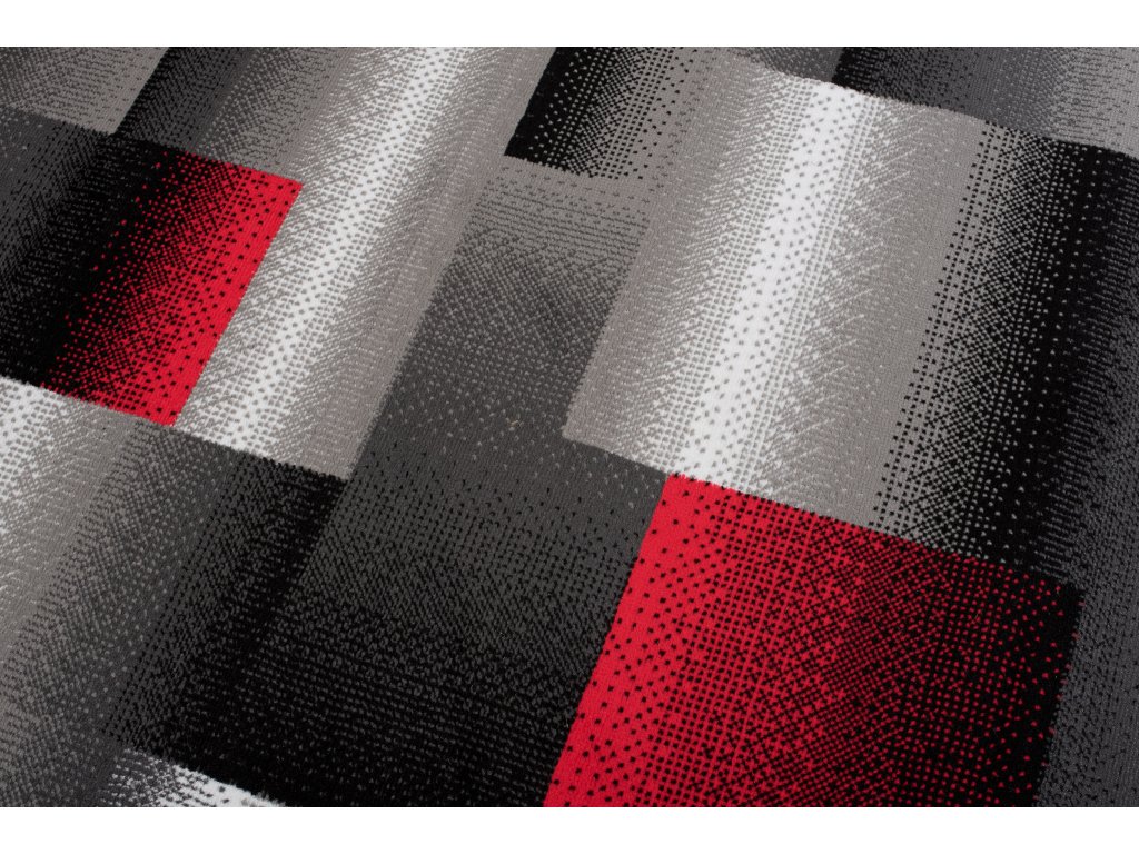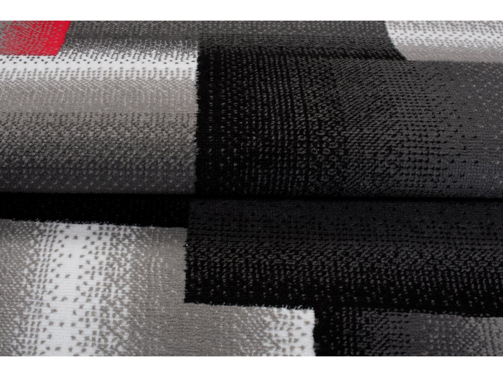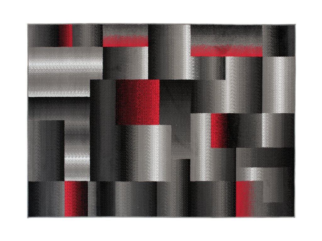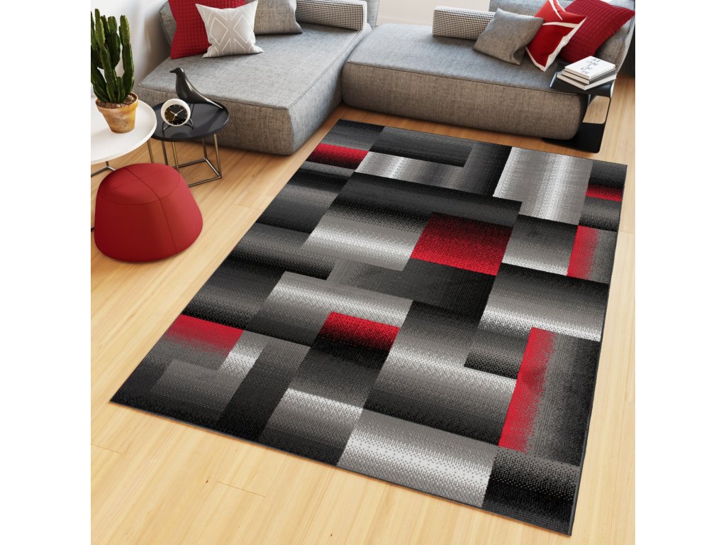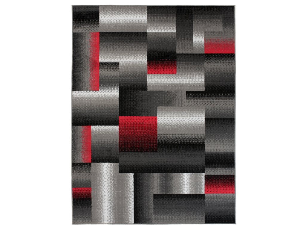Kusový koberec moderní MAYA Z904E šedý červený s moderním geometrickým vzorem.