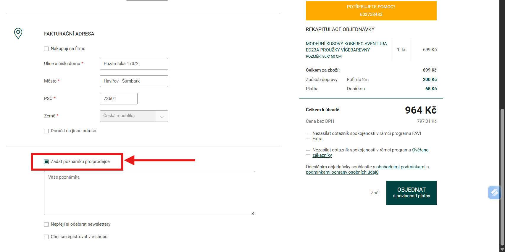 Kupující může požadovaný termín dodání uvést v objednávkovém formuláři (po vyplnění Vaší adresy ve třetím kroku objednávky - "Zadat poznámku pro prodejce" - viz. obr. č. 1).