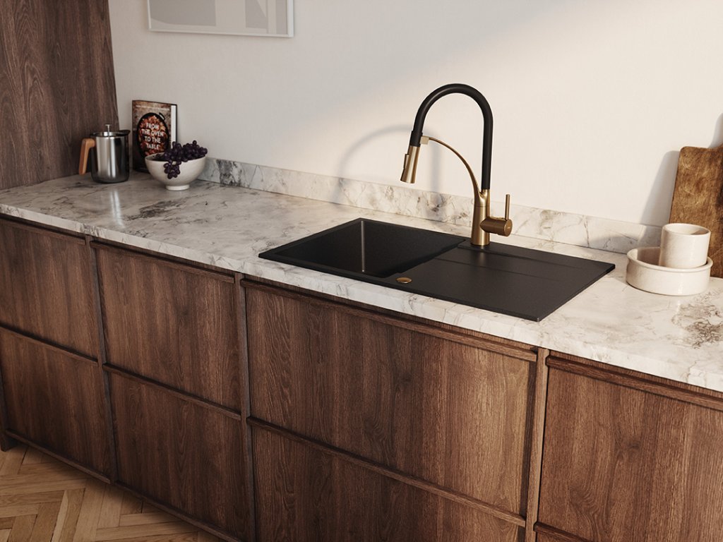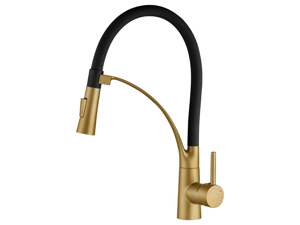 Vodovodní baterie je vyrobena z vysoce kvalitní mosazi, což zajišťuje její odolnost vůči intenzivnímu používání. Zlatá kartáčovaná povrchová úprava v kombinaci s elegantní černou barvou mu dodává jedinečný charakter, který se dokonale hodí do moderního i klasického kuchyňského uspořádání.