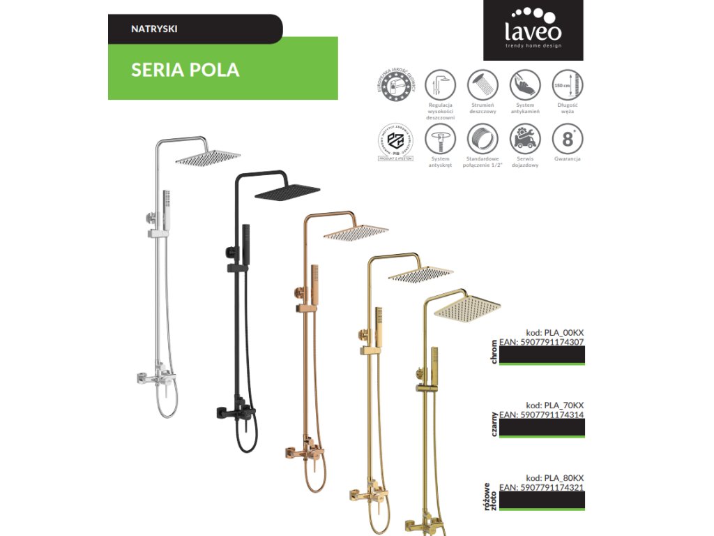 Řada Pola se rozšířila o modely s rozprašovačem. Patří mezi ně sprchová hlavice, bodový set, set na tyči a sprchový sloup s baterií. Všechny tři modely jsou k dispozici ve čtyřech povrchových úpravách.