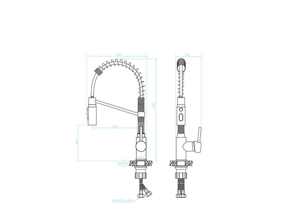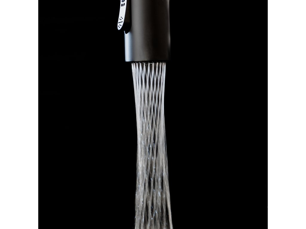 Flexibilní výtok, opletený pružinou, zajišťuje naprostou volnost pohybu a přesné ovládání průtoku vody, což výrazně usnadňuje každodenní kuchyňské činnosti. Mytí nádobí a oplachování zeleniny a ovoce se stává snazším a pohodlnějším a plná kontrola nad průtokem vody zvyšuje pohodlí při používání.