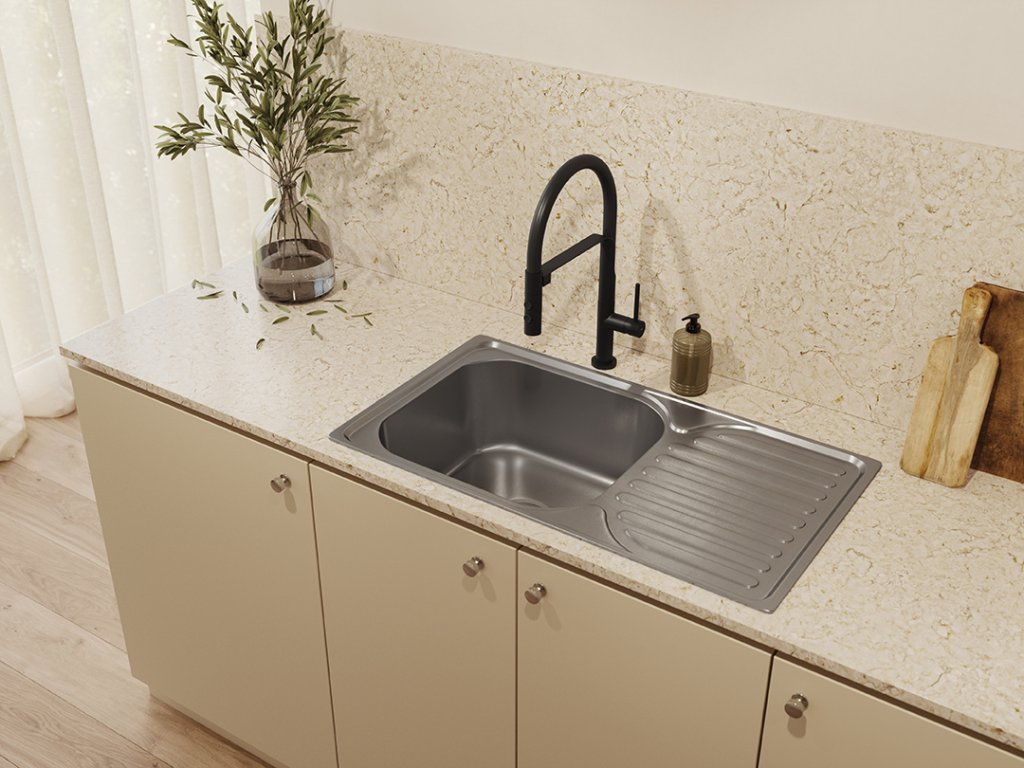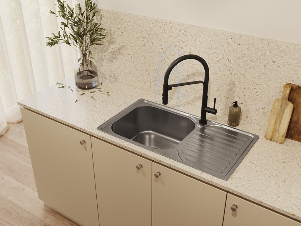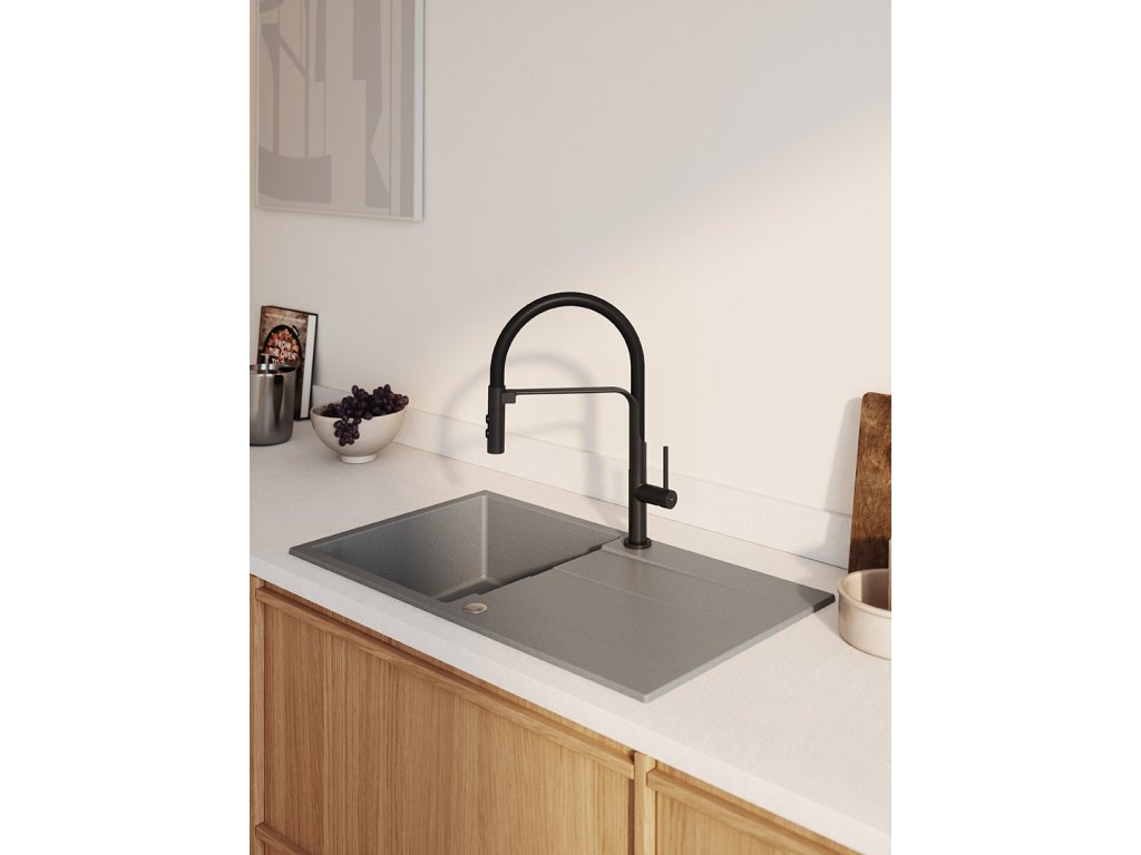 Černá dřezová baterie Siluetto je kombinací moderního designu, funkčnosti a úspory vody. Díky svému decentnímu a štíhlému tvaru dokonale vyhovuje požadavkům moderních kuchyní a kombinuje eleganci s bezkonkurenčním komfortem používání.